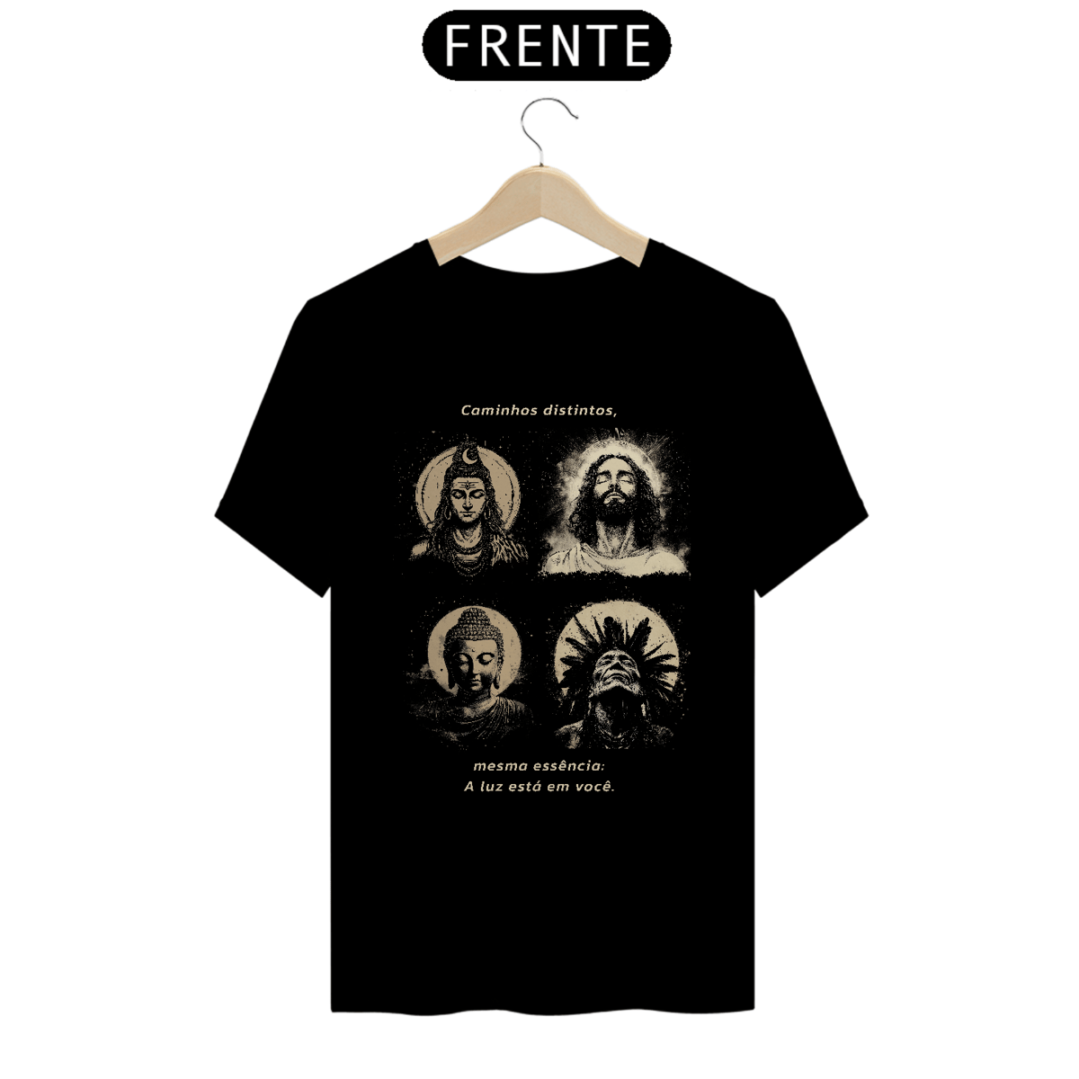 Uma homenagem visual aos grandes mestres espirituais da humanidade: Shiva, Jesus Cristo, Buda e o Pajé da floresta, unidos em uma composição poderosa e serena. Esta estampa não celebra uma religião específica, mas sim o autoconhecimento como caminho universal.