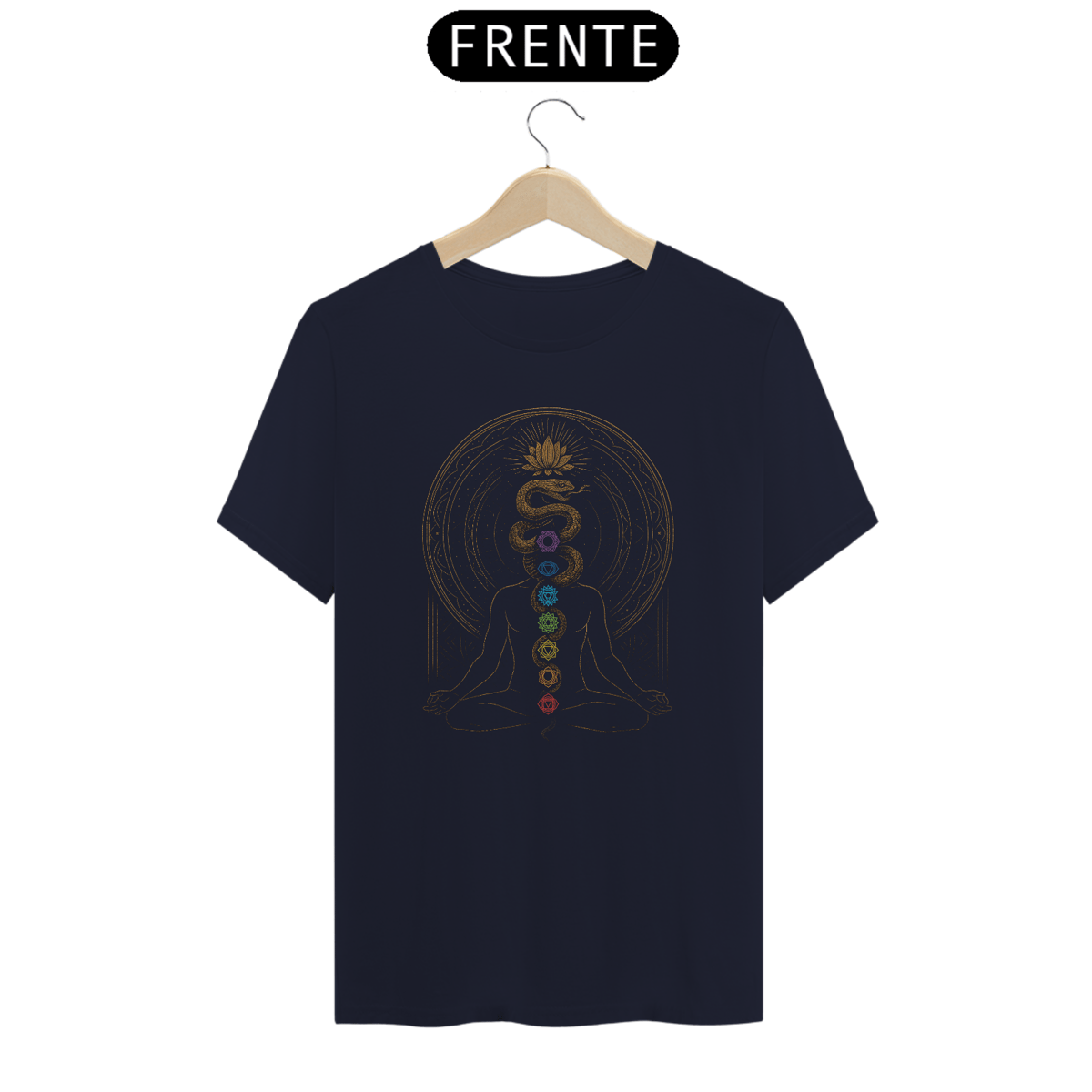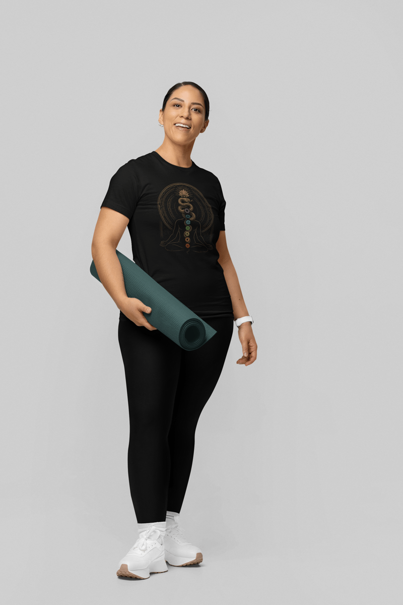 Sintonize sua energia interior com essa camiseta inspirada no despertar da Kundalini. A estampa representa a silhueta em meditação, com a serpente cósmica ascendente alinhando os sete chakras — símbolo da elevação espiritual e do equilíbrio energético. Feita em tecido leve e confortável, esta peça é perfeita para práticas de yoga, meditação ou para carregar vibrações elevadas no dia a dia. Ideal para quem busca autoconhecimento, harmonia e conexão com o universo.